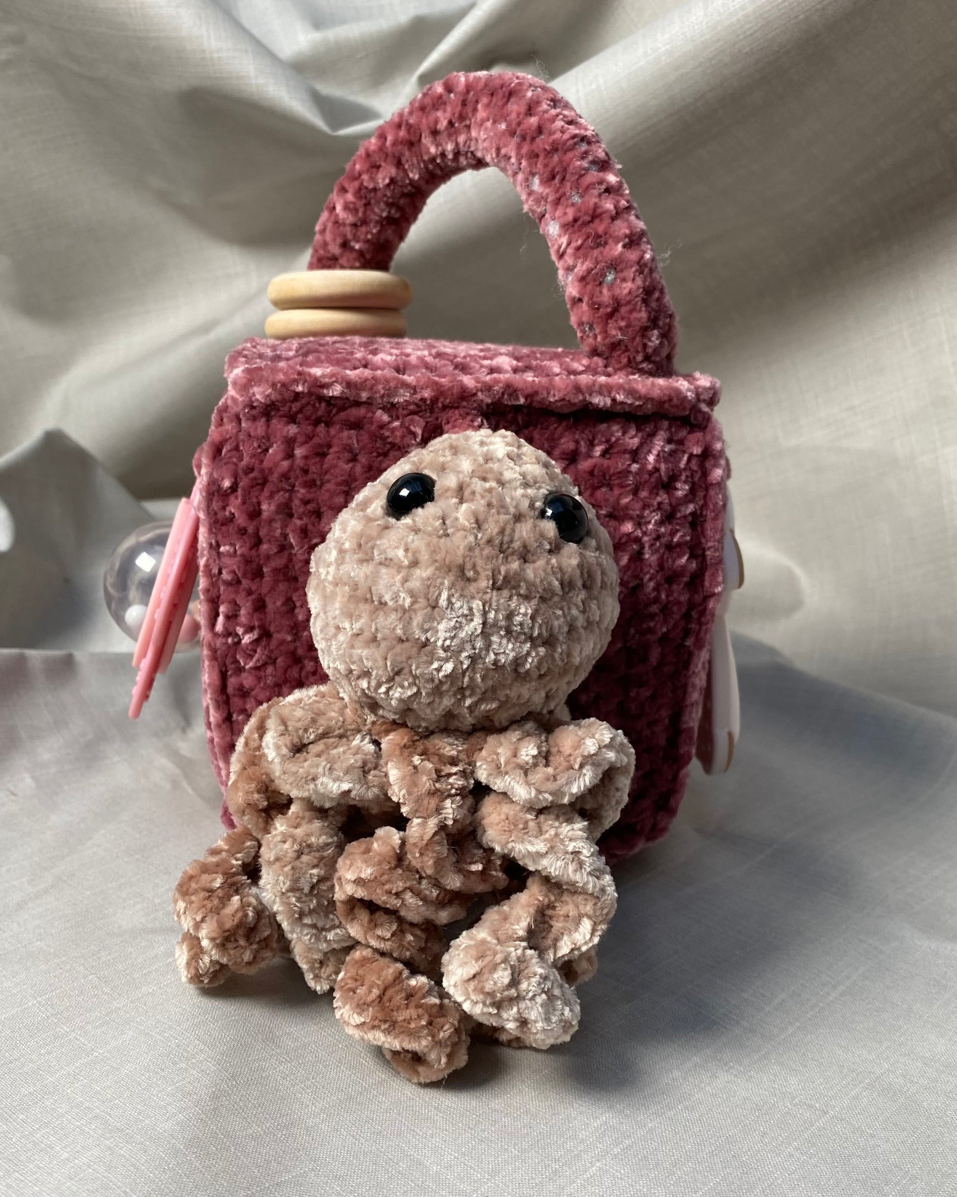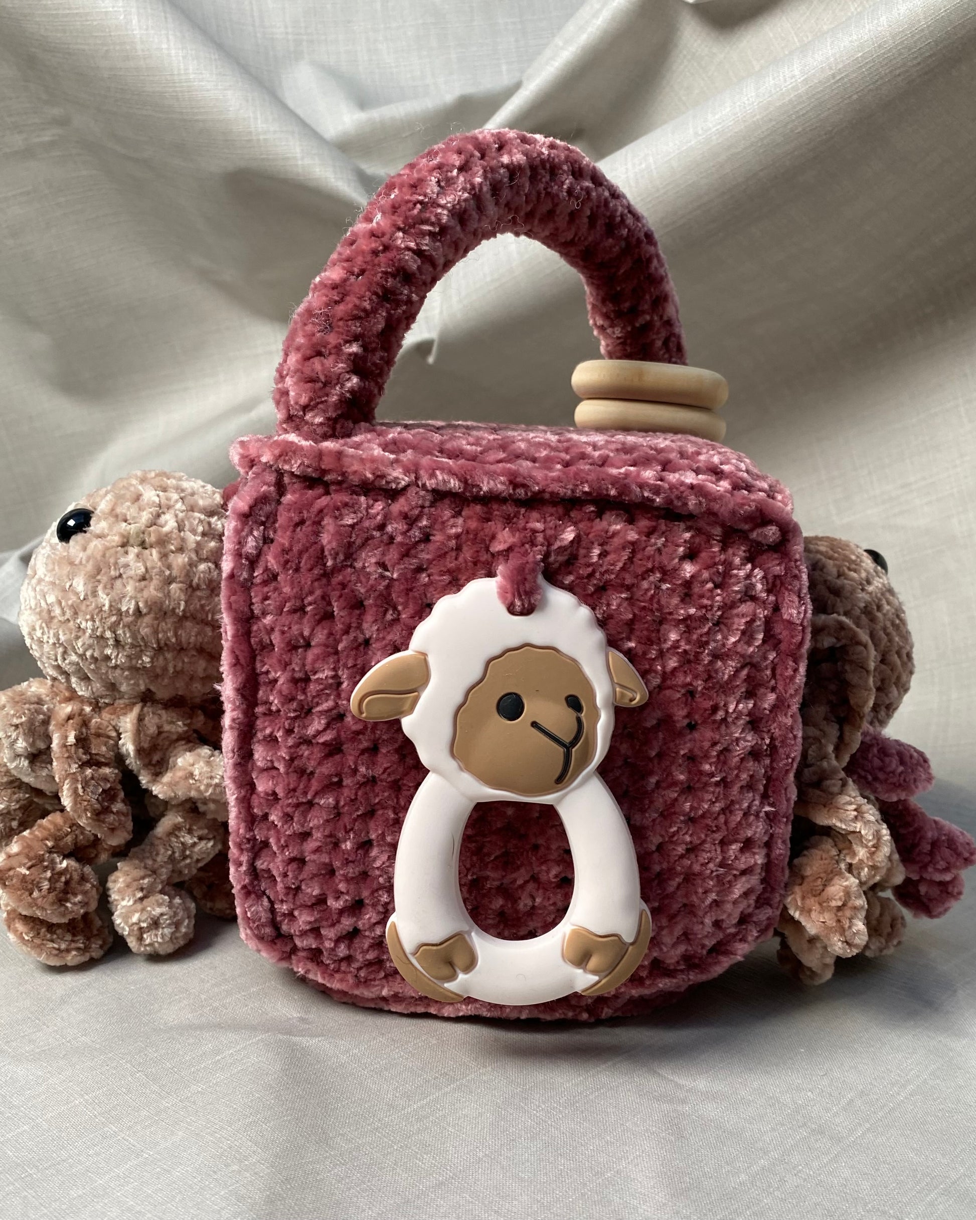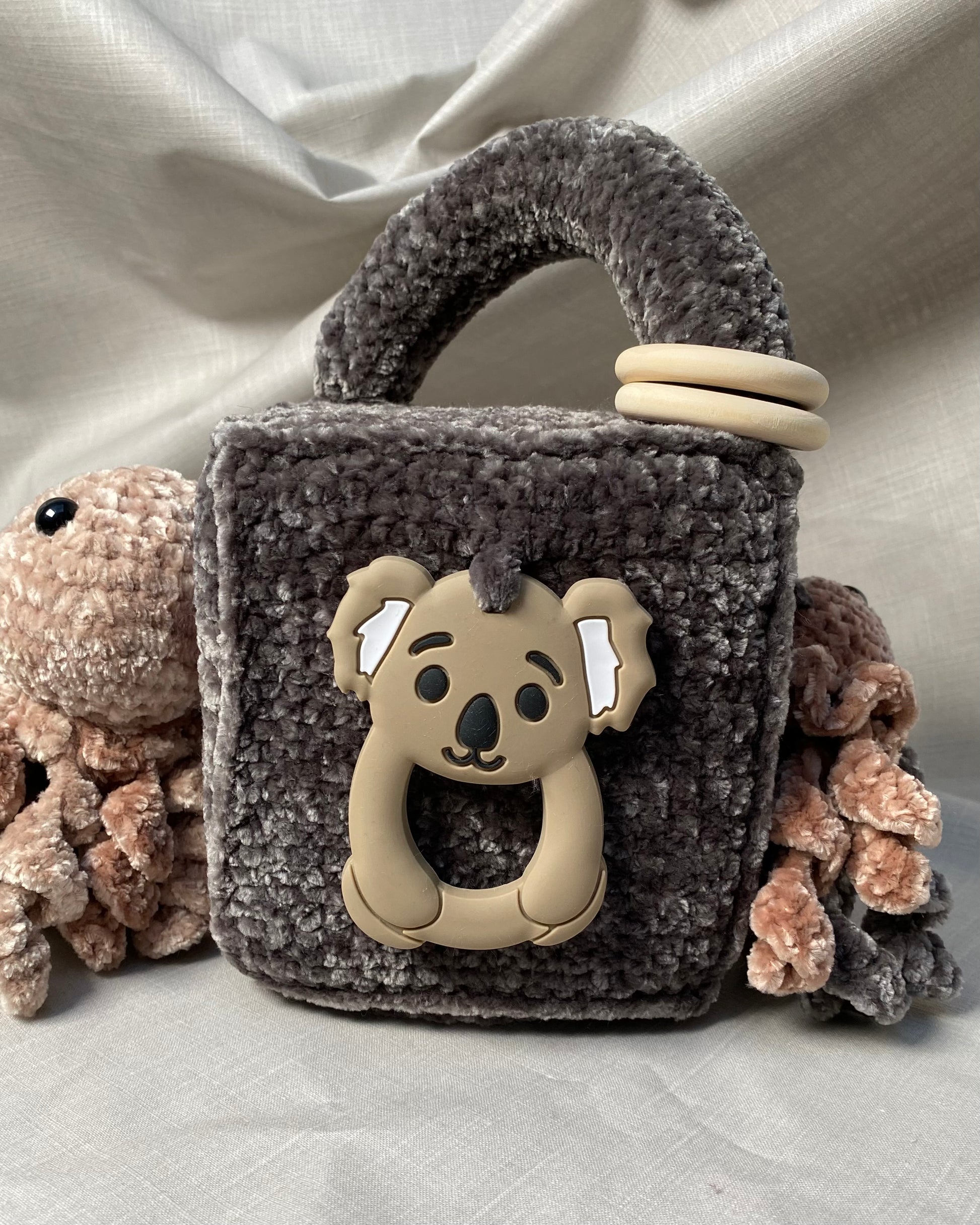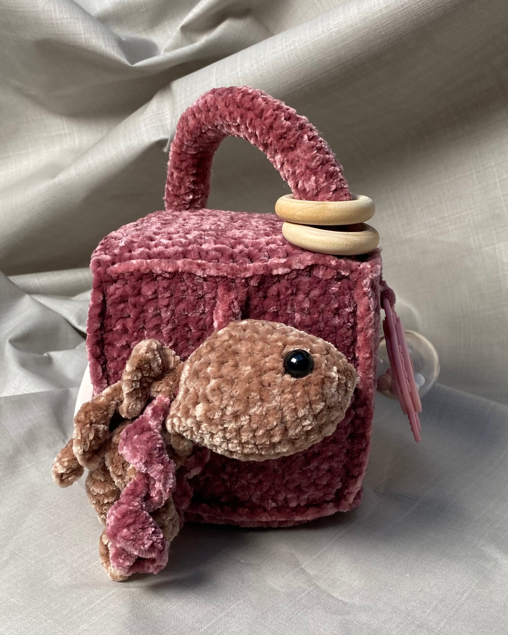 Hlíðar: Sílikon nagdýr, heklaður fiskur með tíst belg inní, blóma hringla, heklaður kolkrabbi með hringla inní.