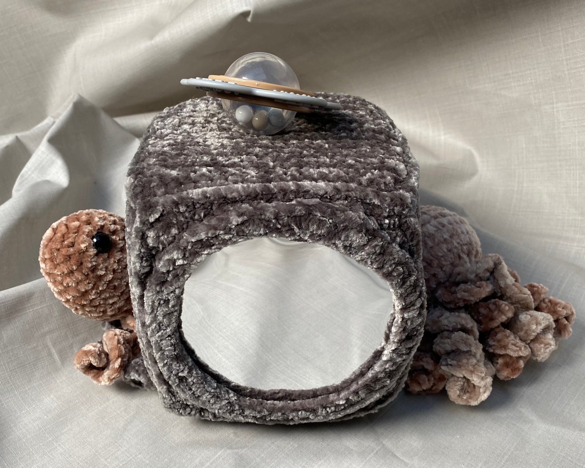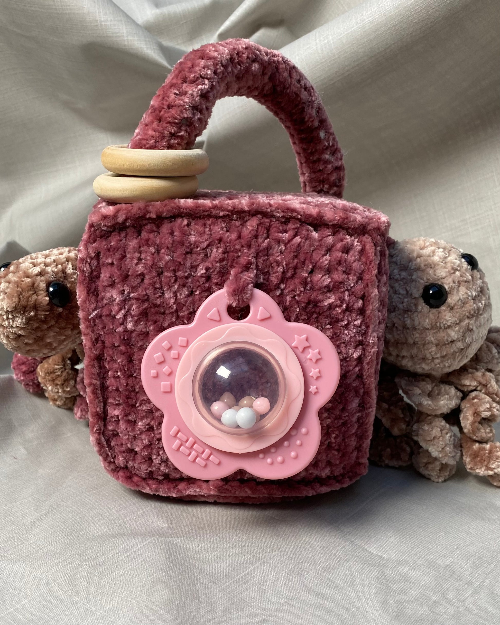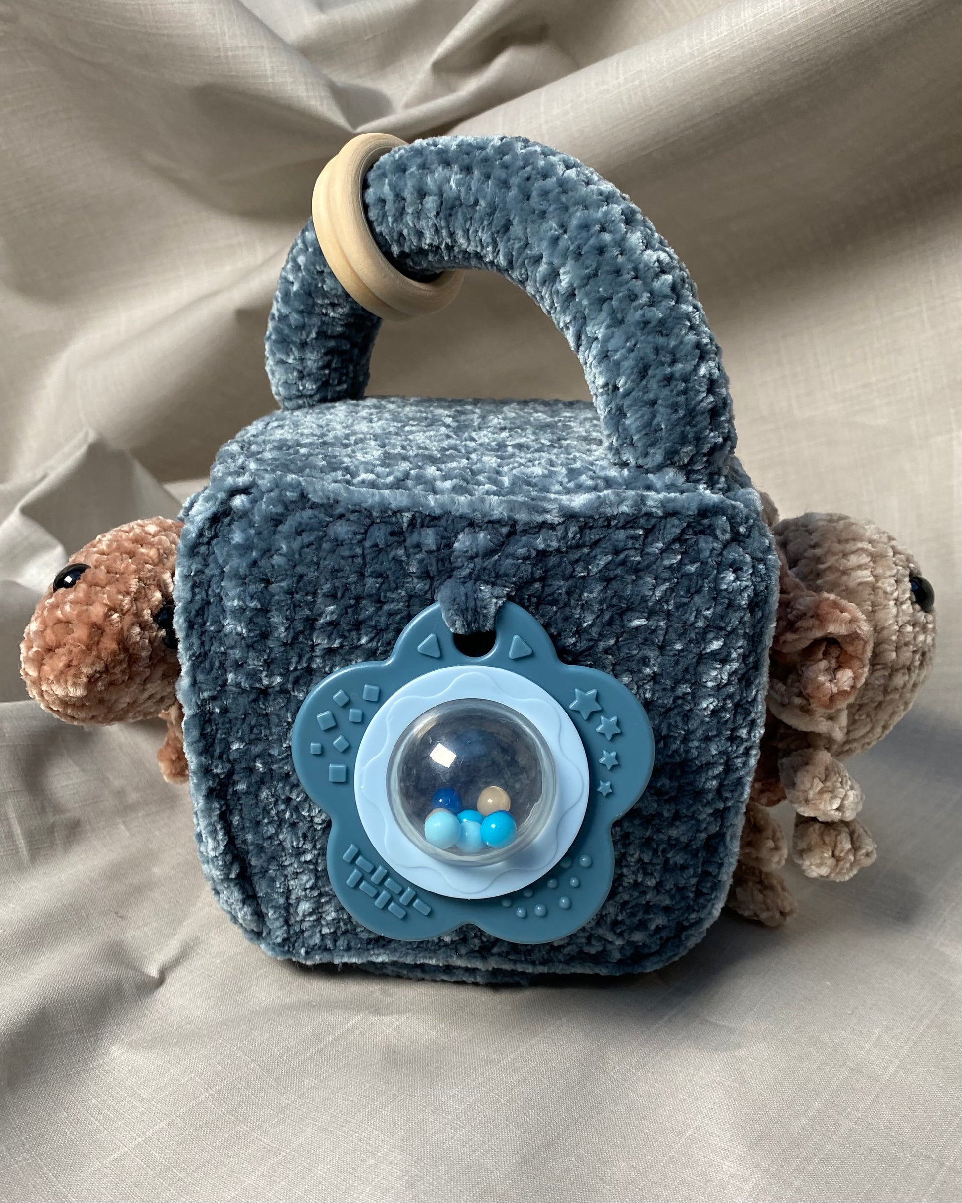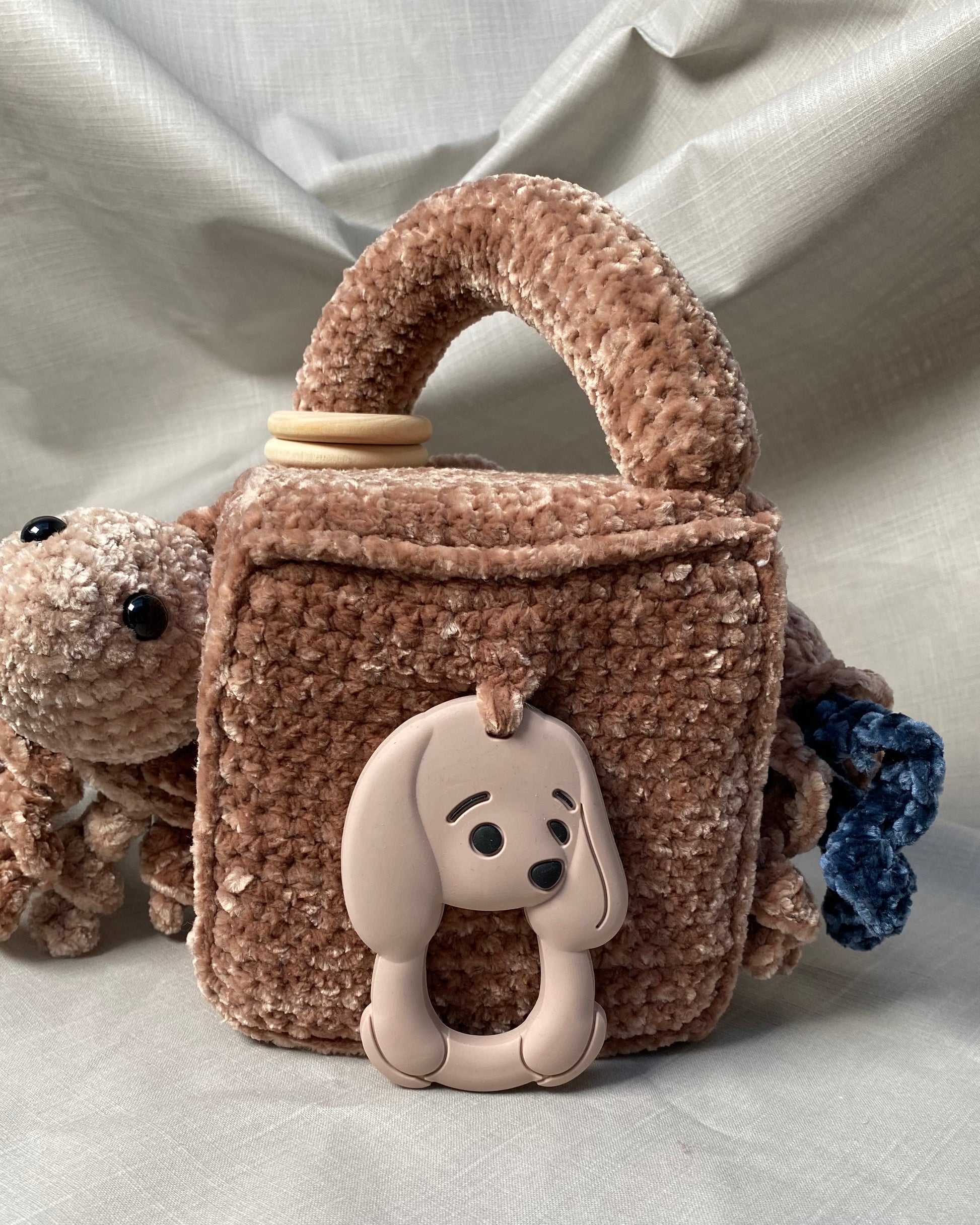 Hlíðar: Sílikon nagdýr, heklaður fiskur með tíst belg inní, blóma hringla, heklaður kolkrabbi með hringla inní.