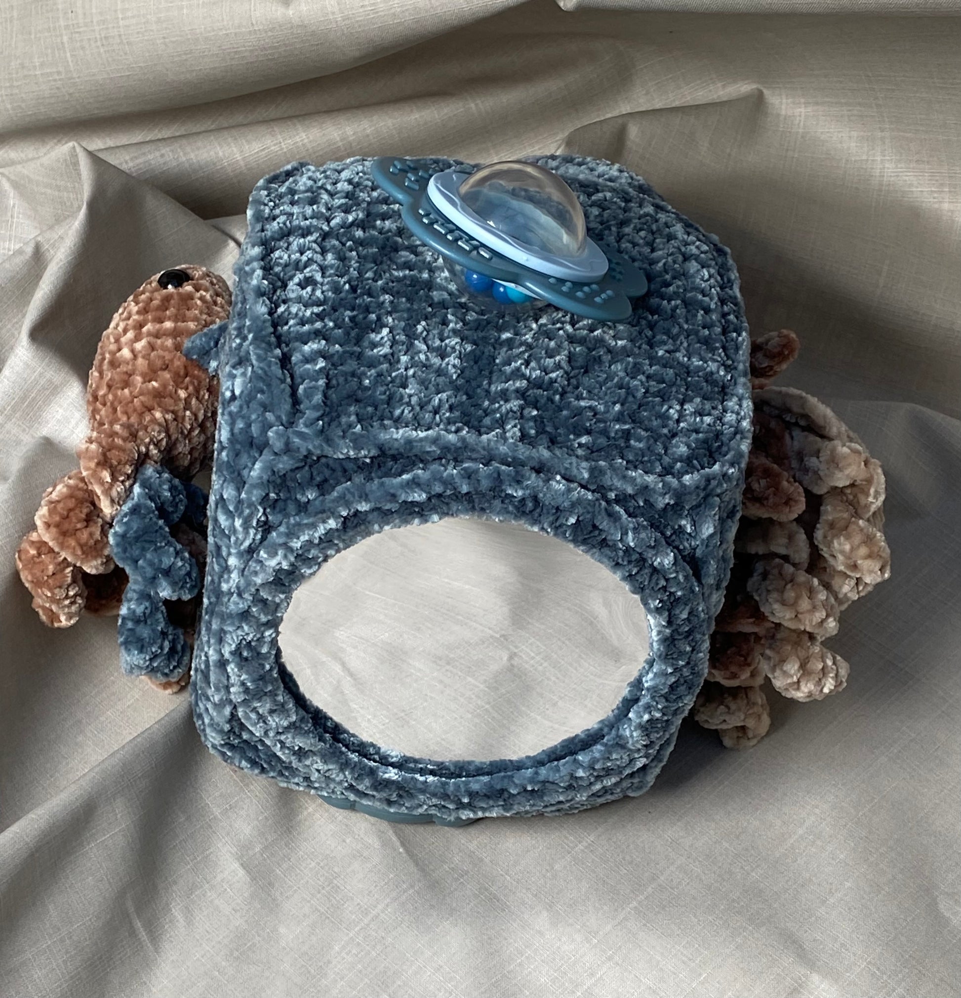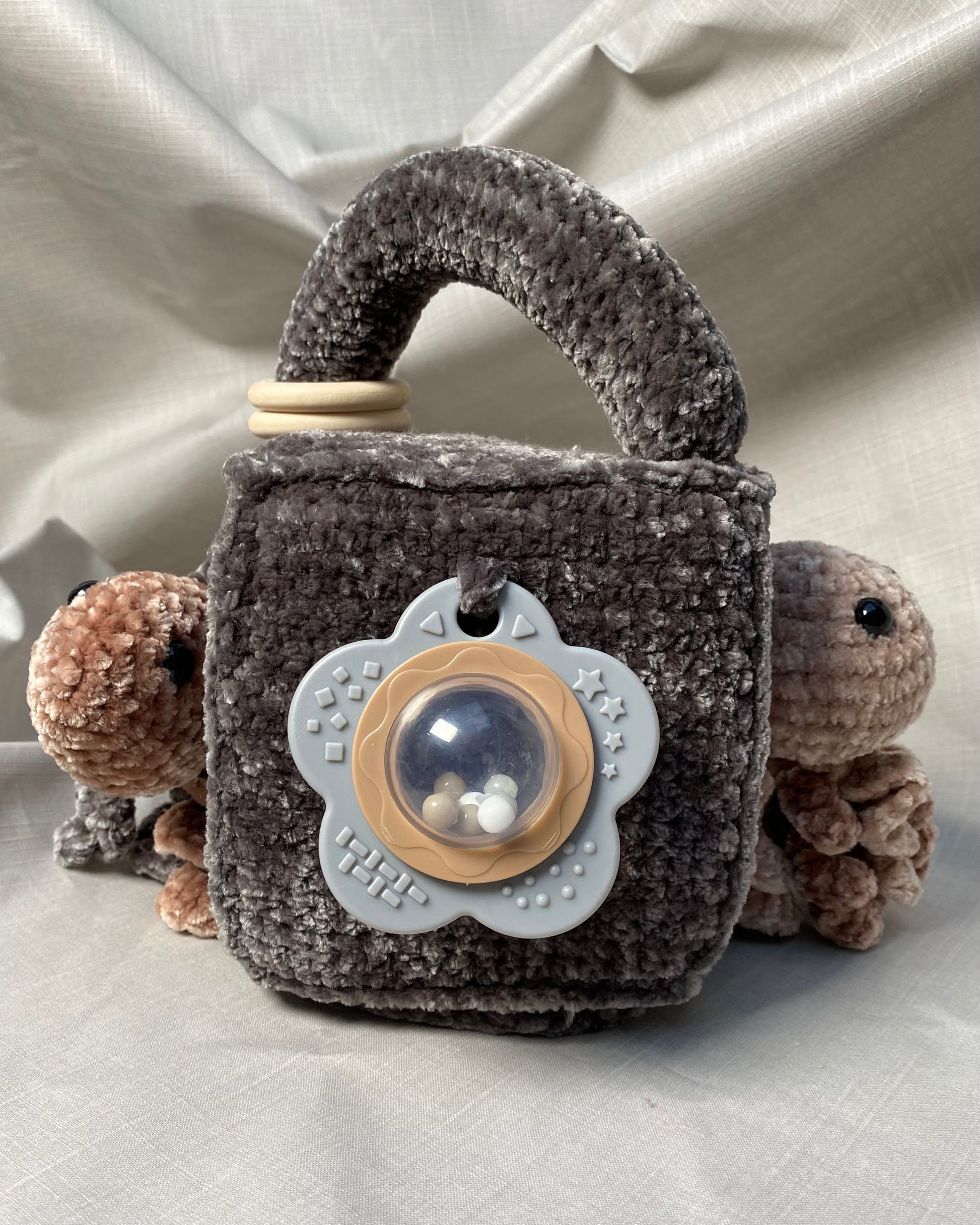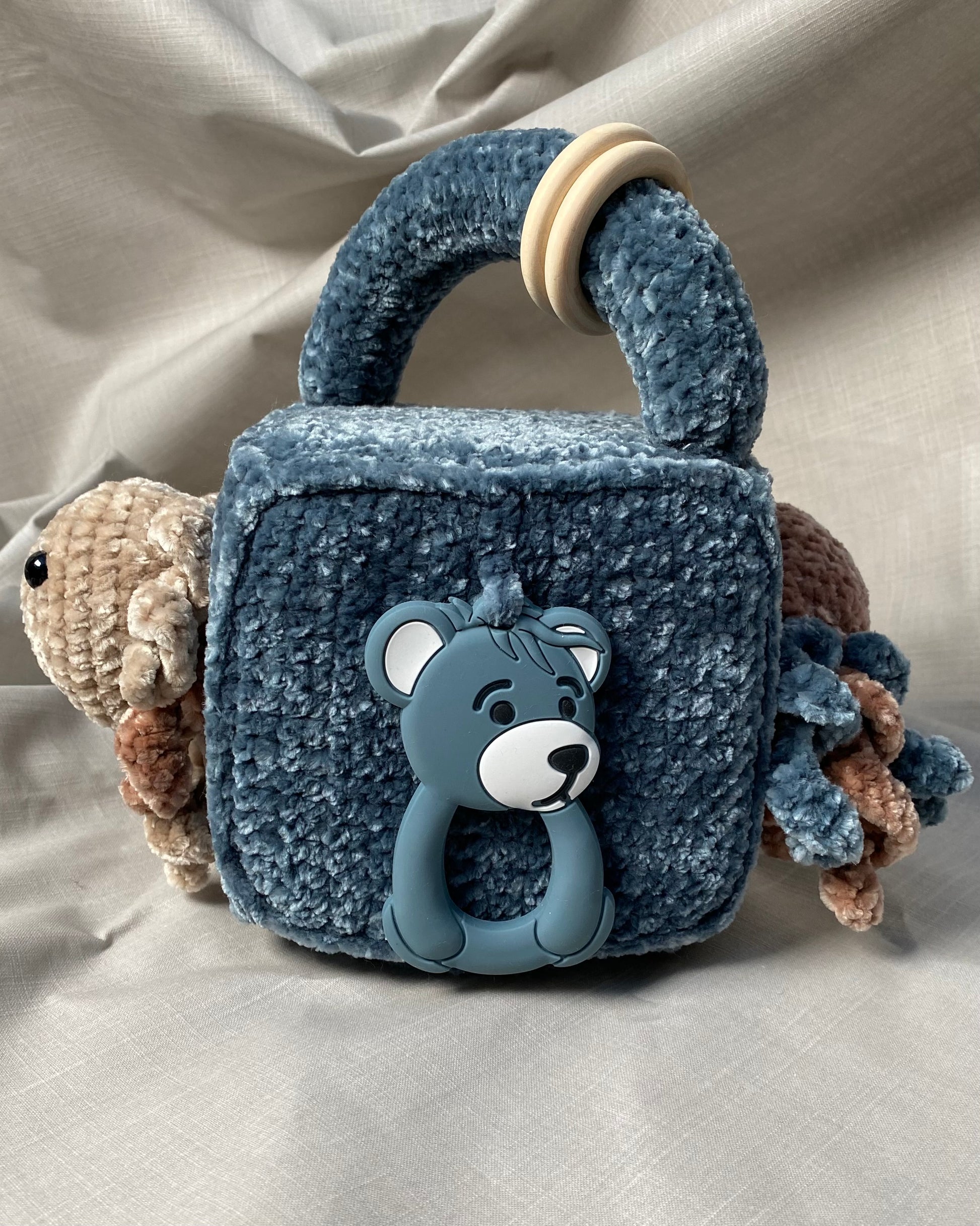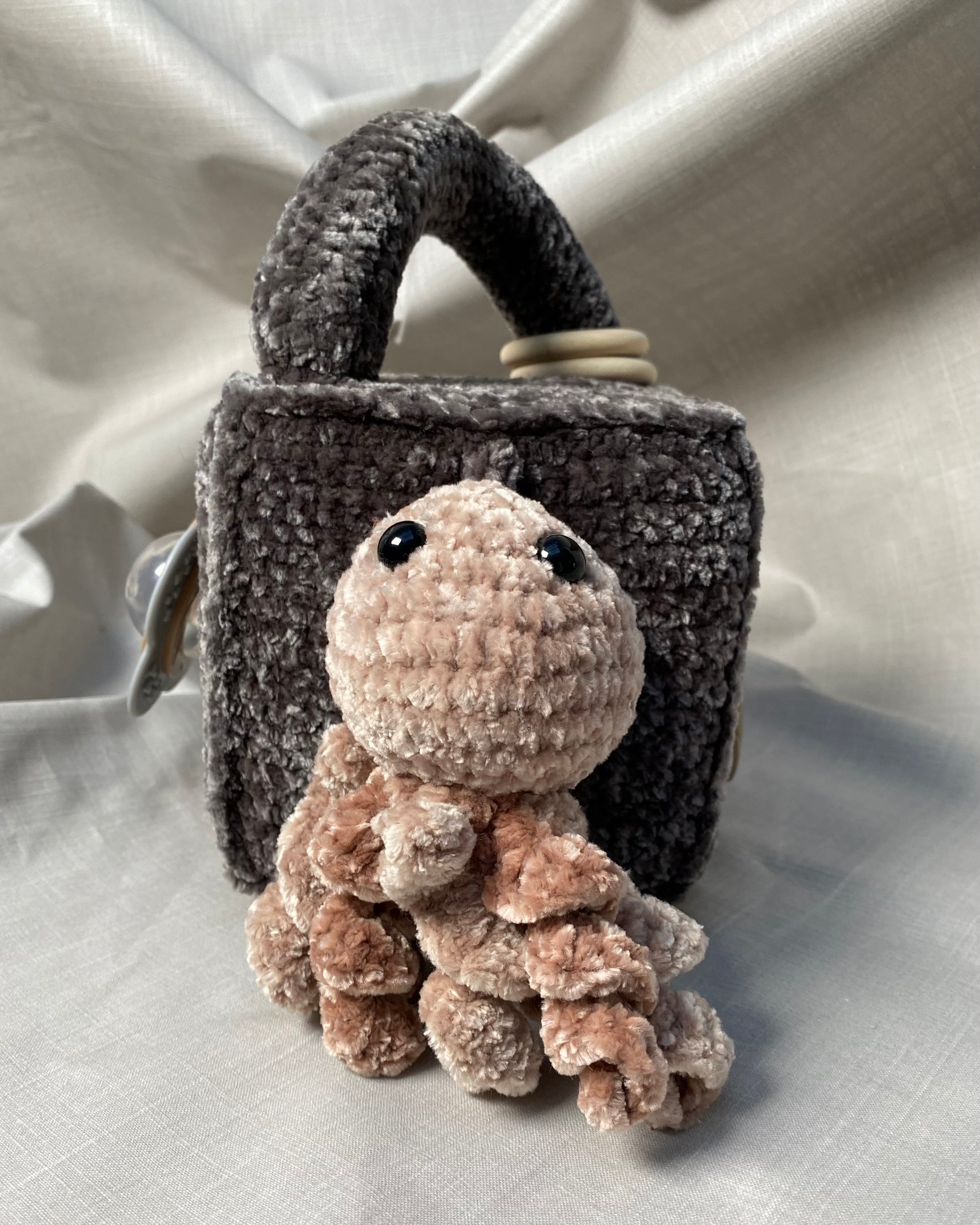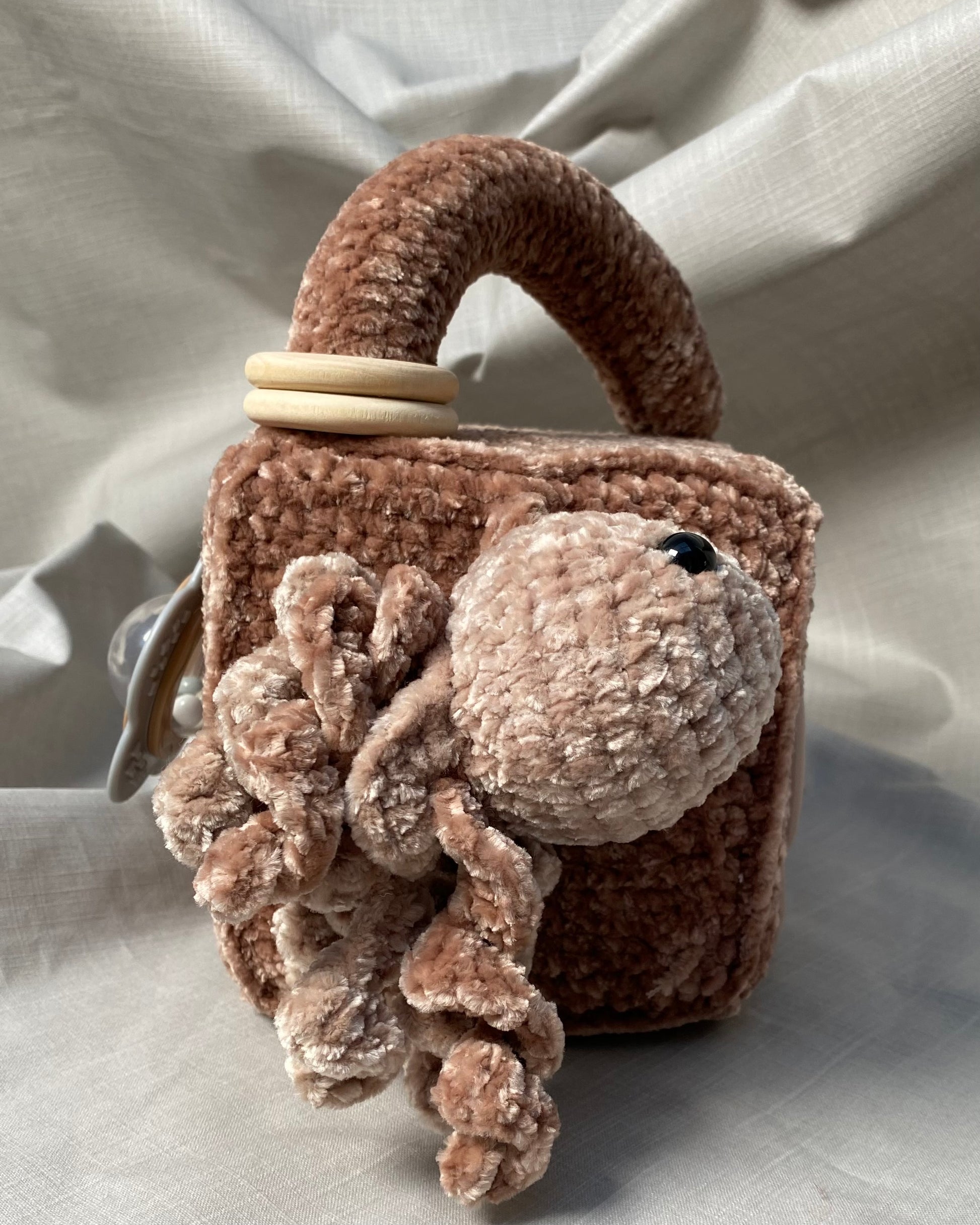 Hlíðar: Sílikon nagdýr, heklaður fiskur með tíst belg inní, blóma hringla, heklaður kolkrabbi með hringla inní.