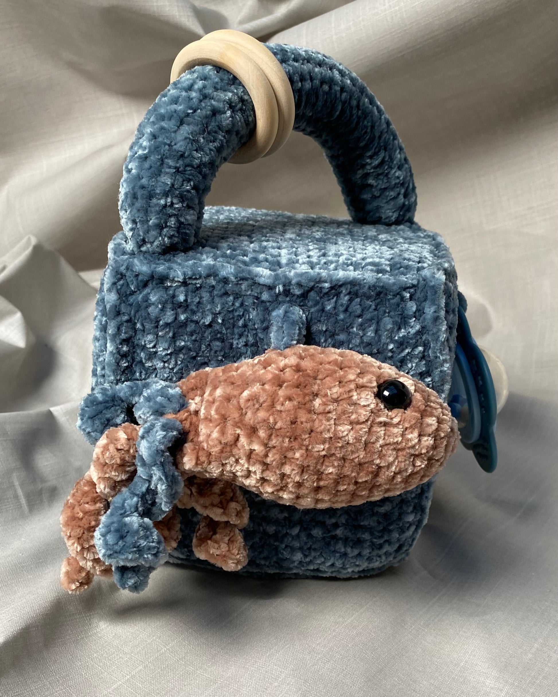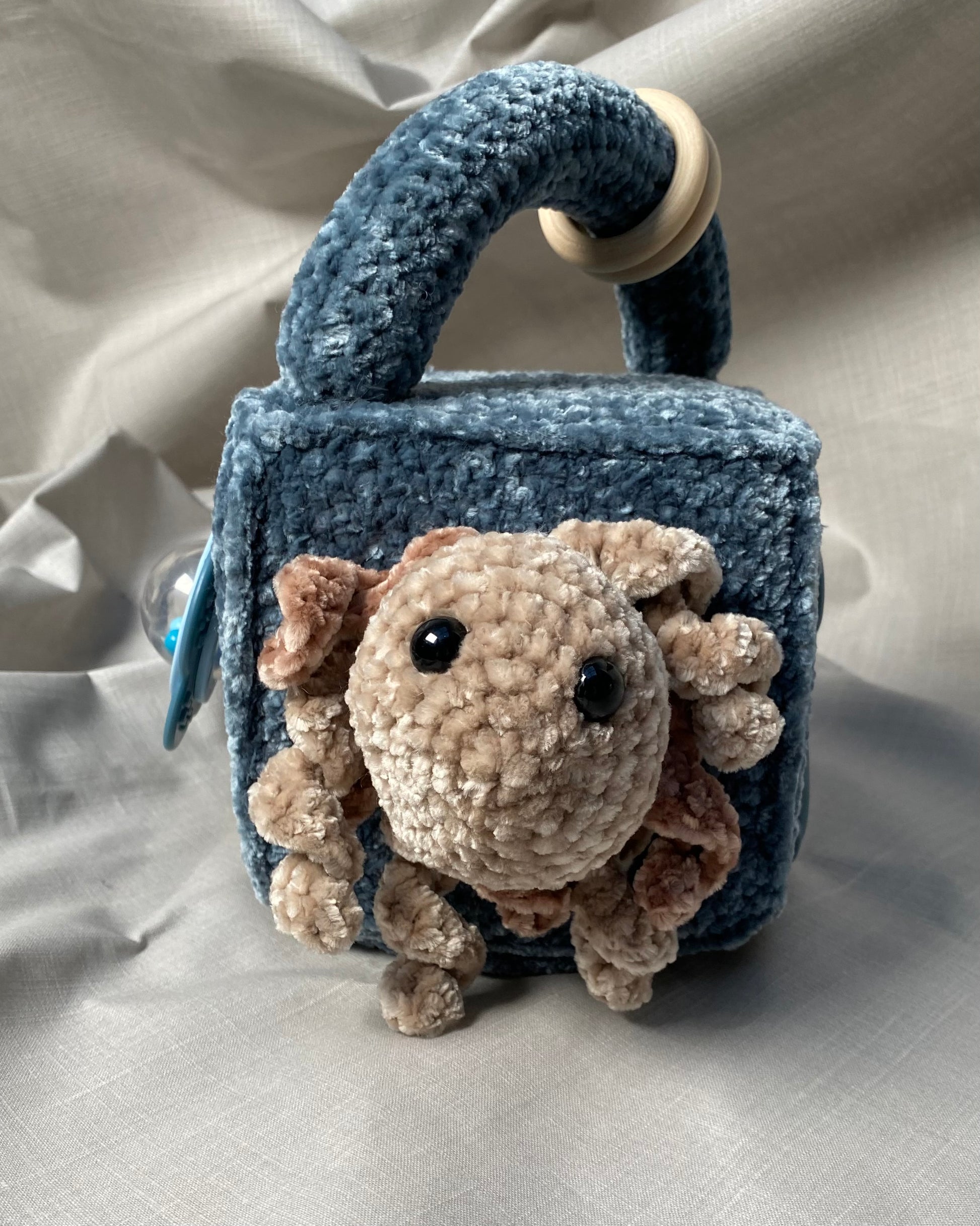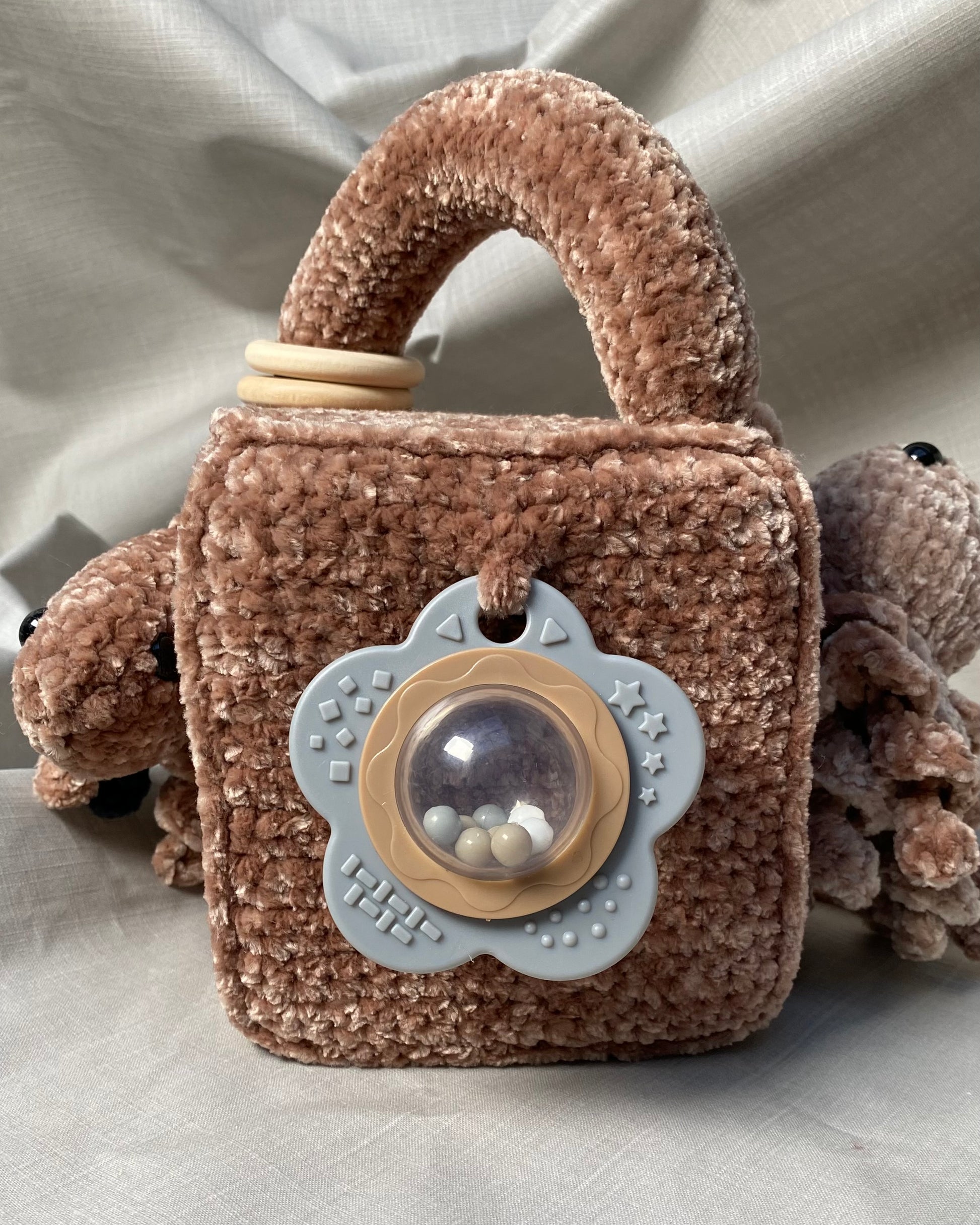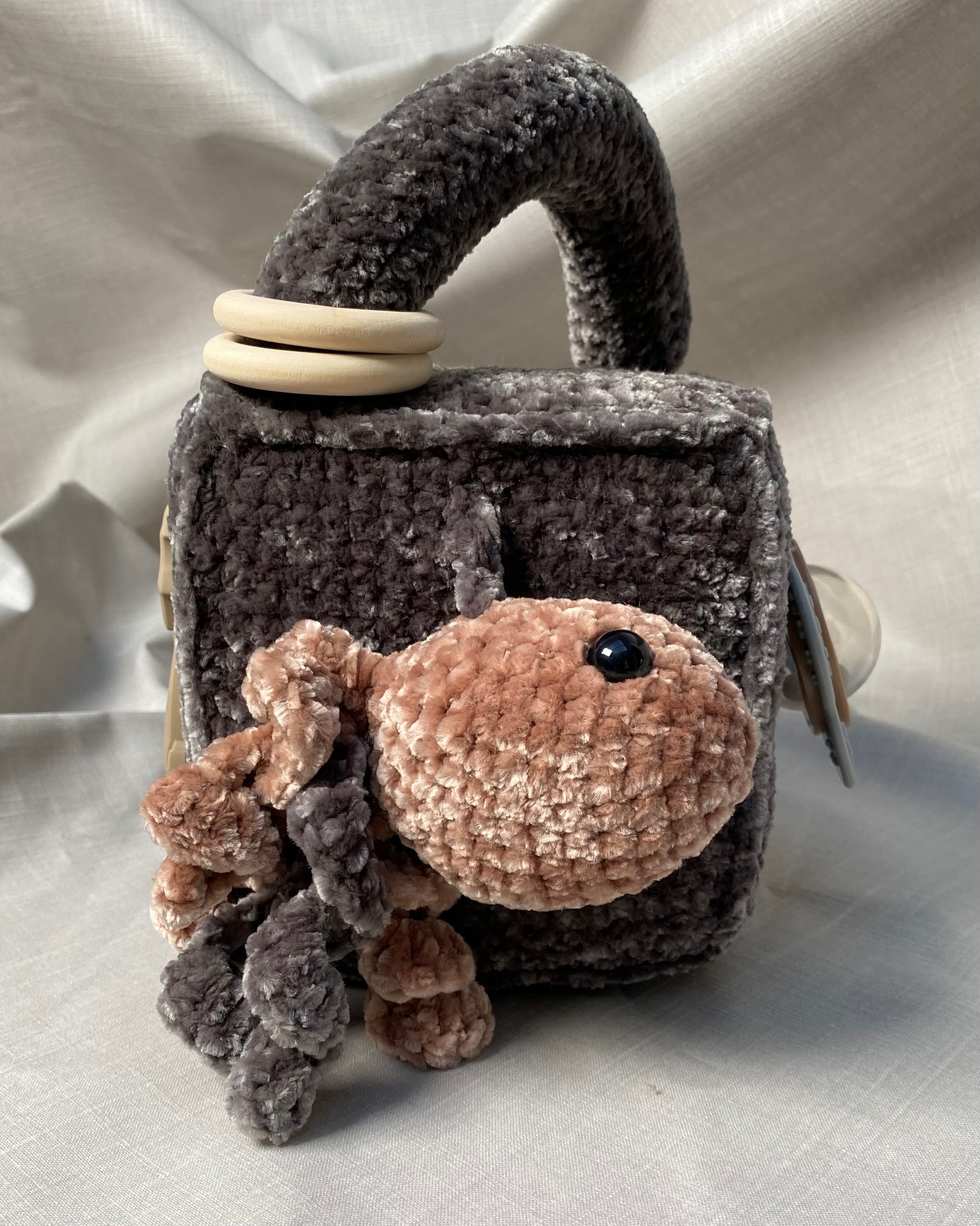 Hlíðar: Sílikon nagdýr, heklaður fiskur með tíst belg inní, blóma hringla, heklaður kolkrabbi með hringla inní.