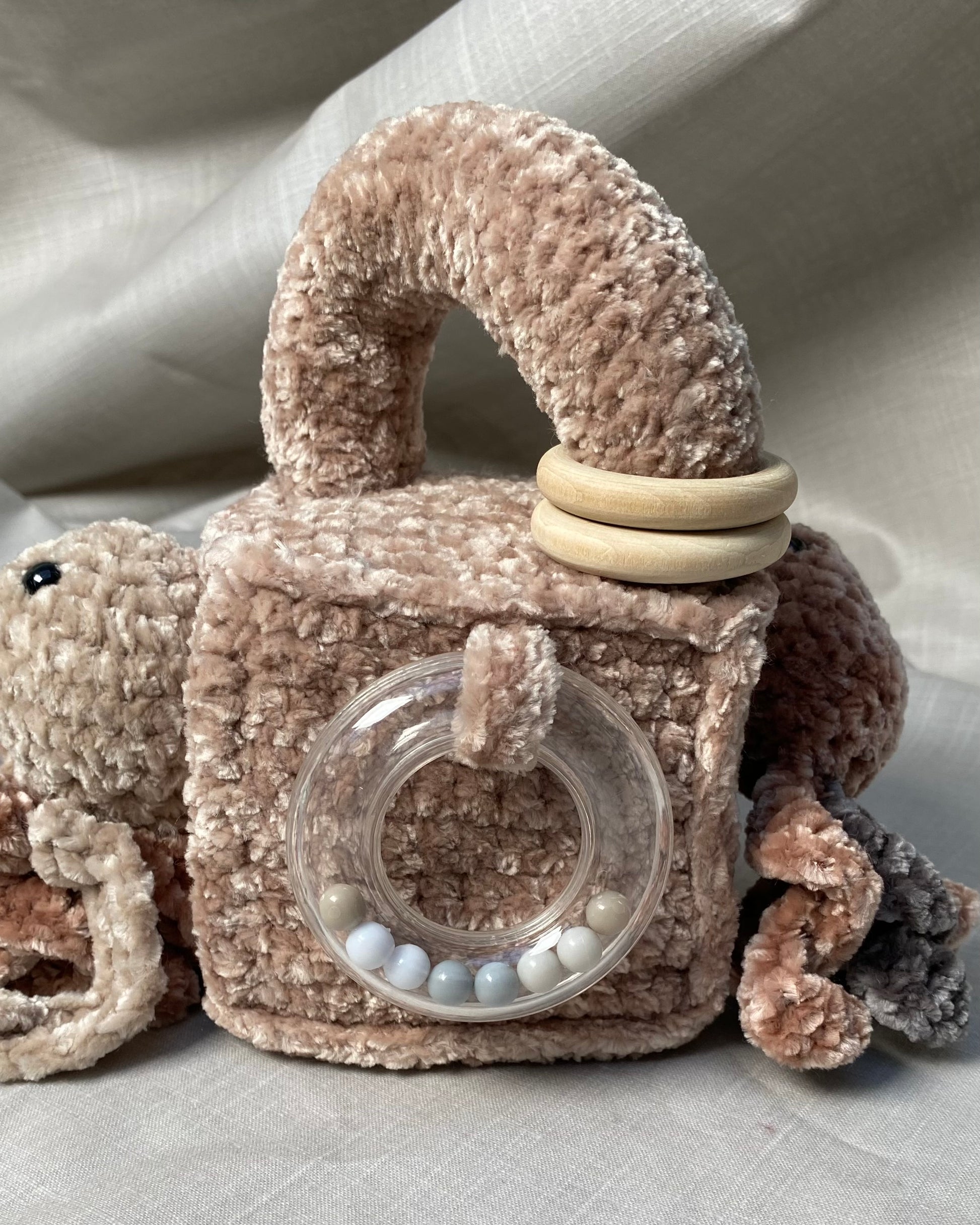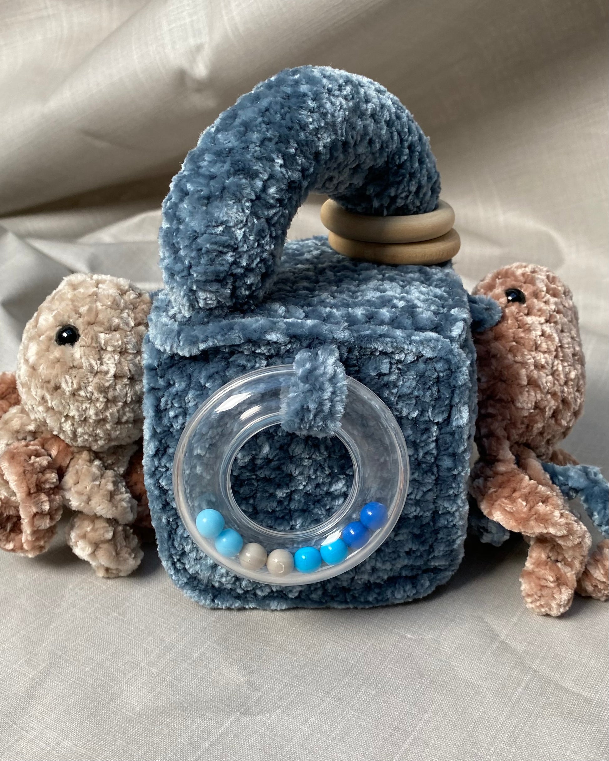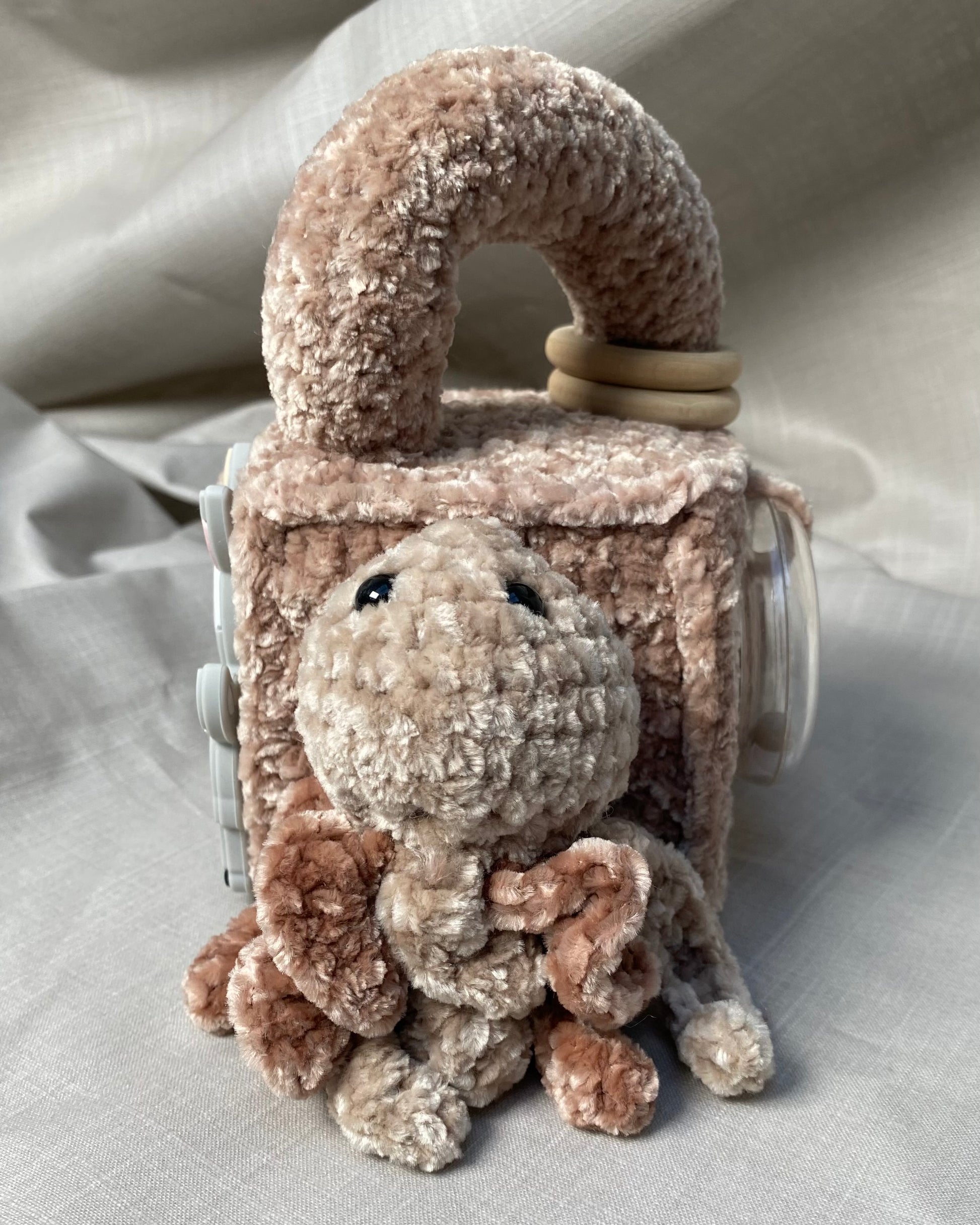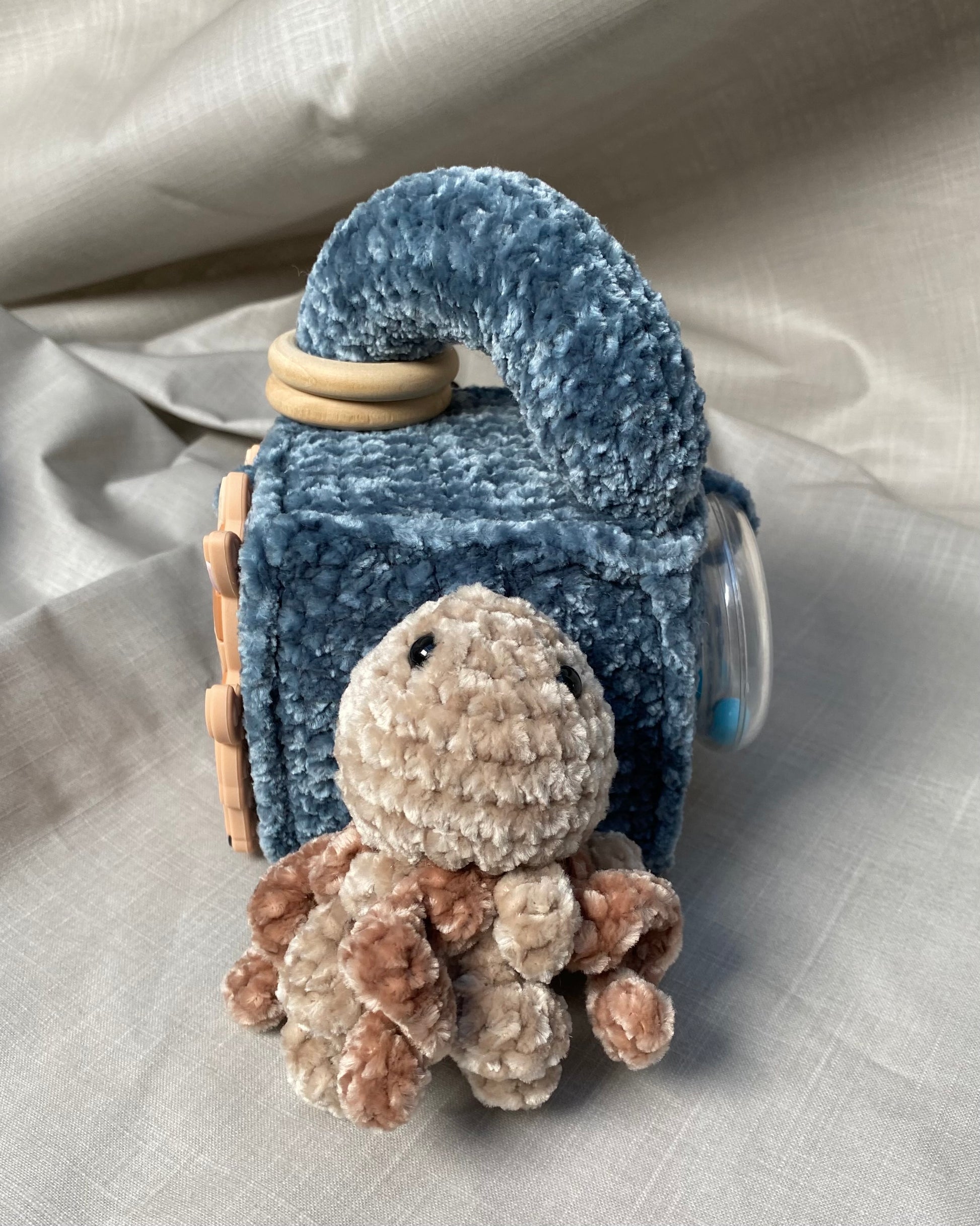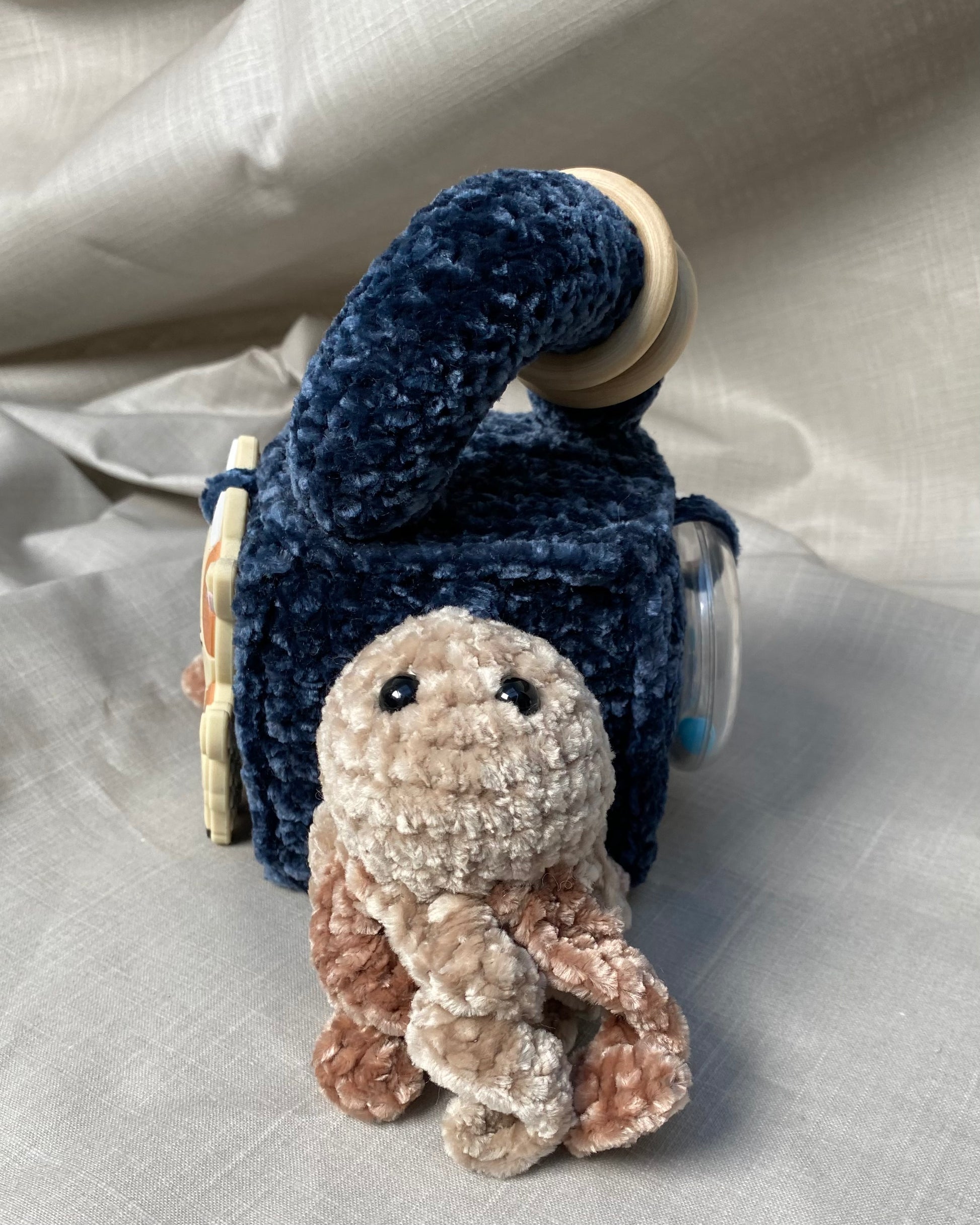 Hlíðar: Sílikon nagdýr, heklaður fiskur með tíst belg inní, hringlaga hringla, heklaður kolkrabbi með hringlu inní.