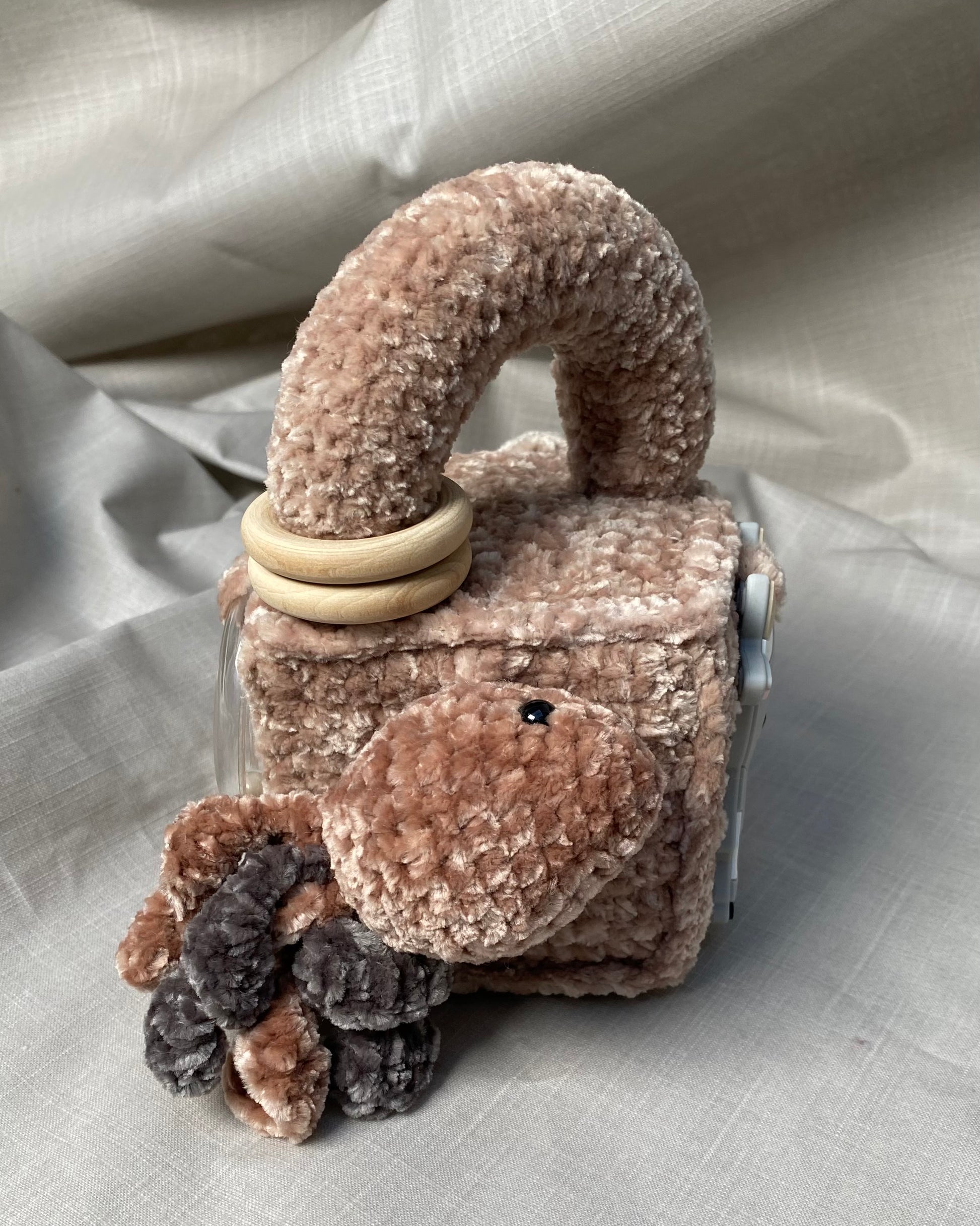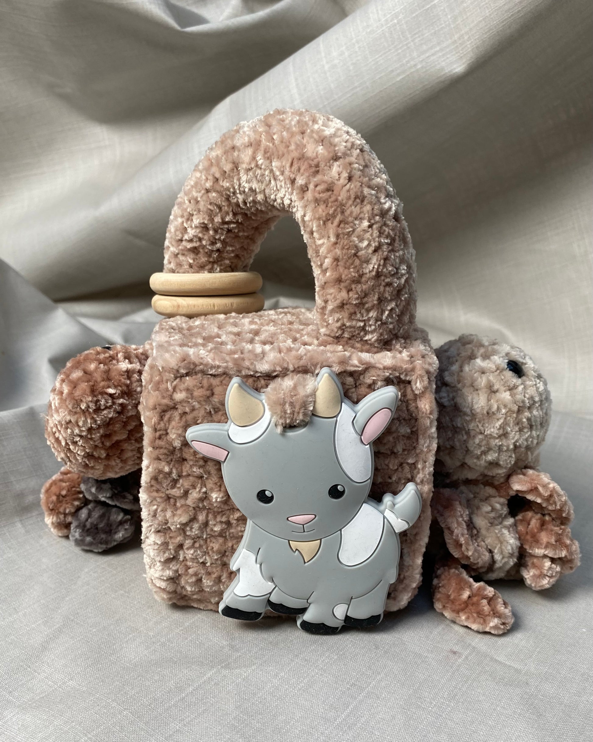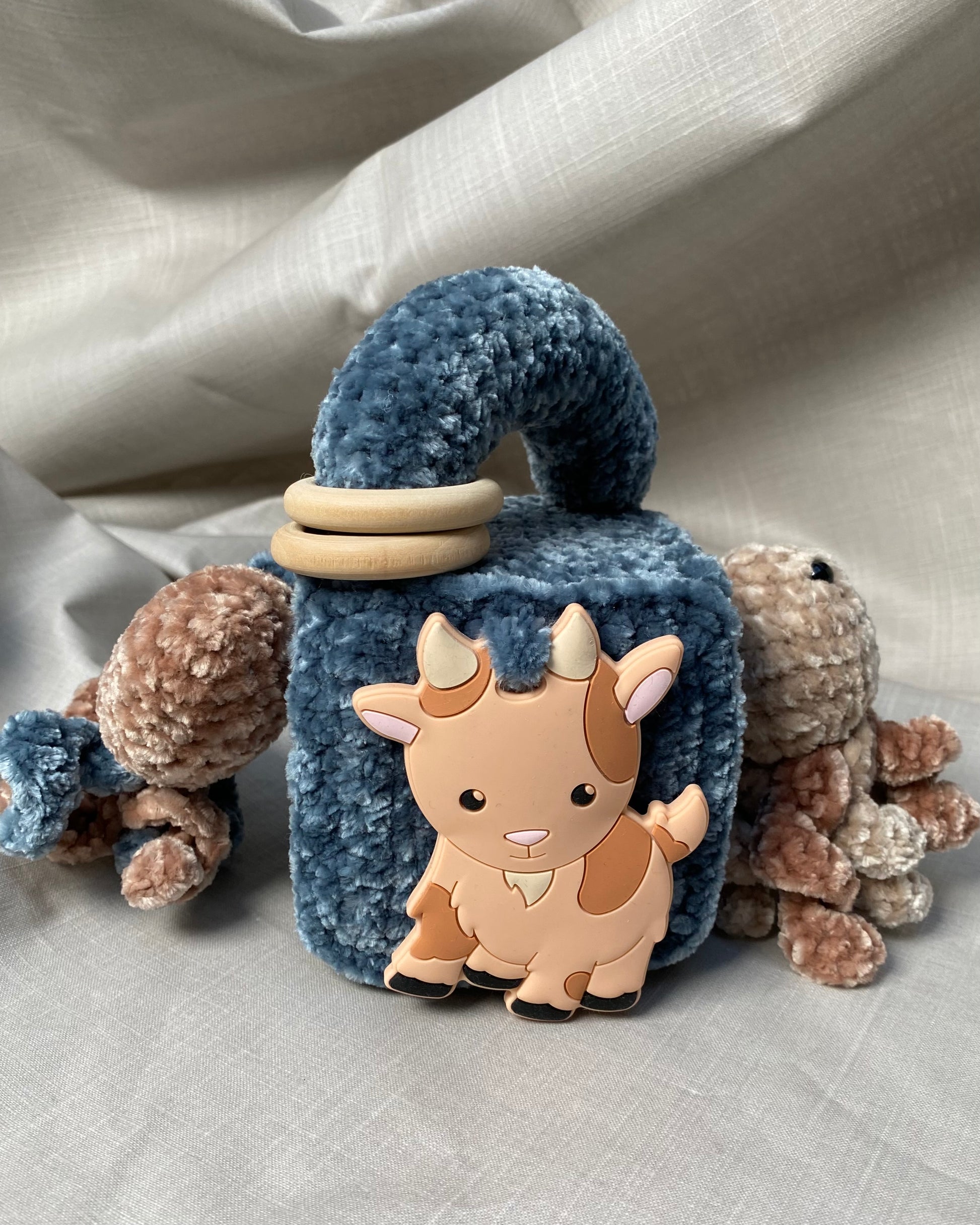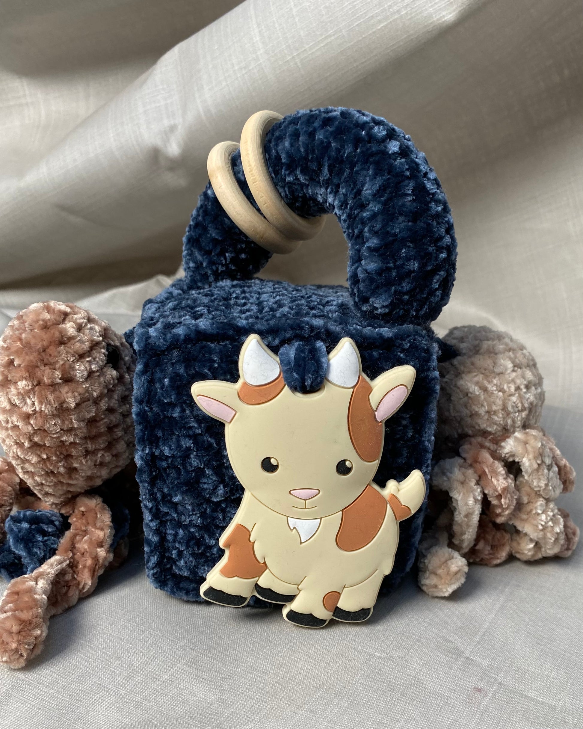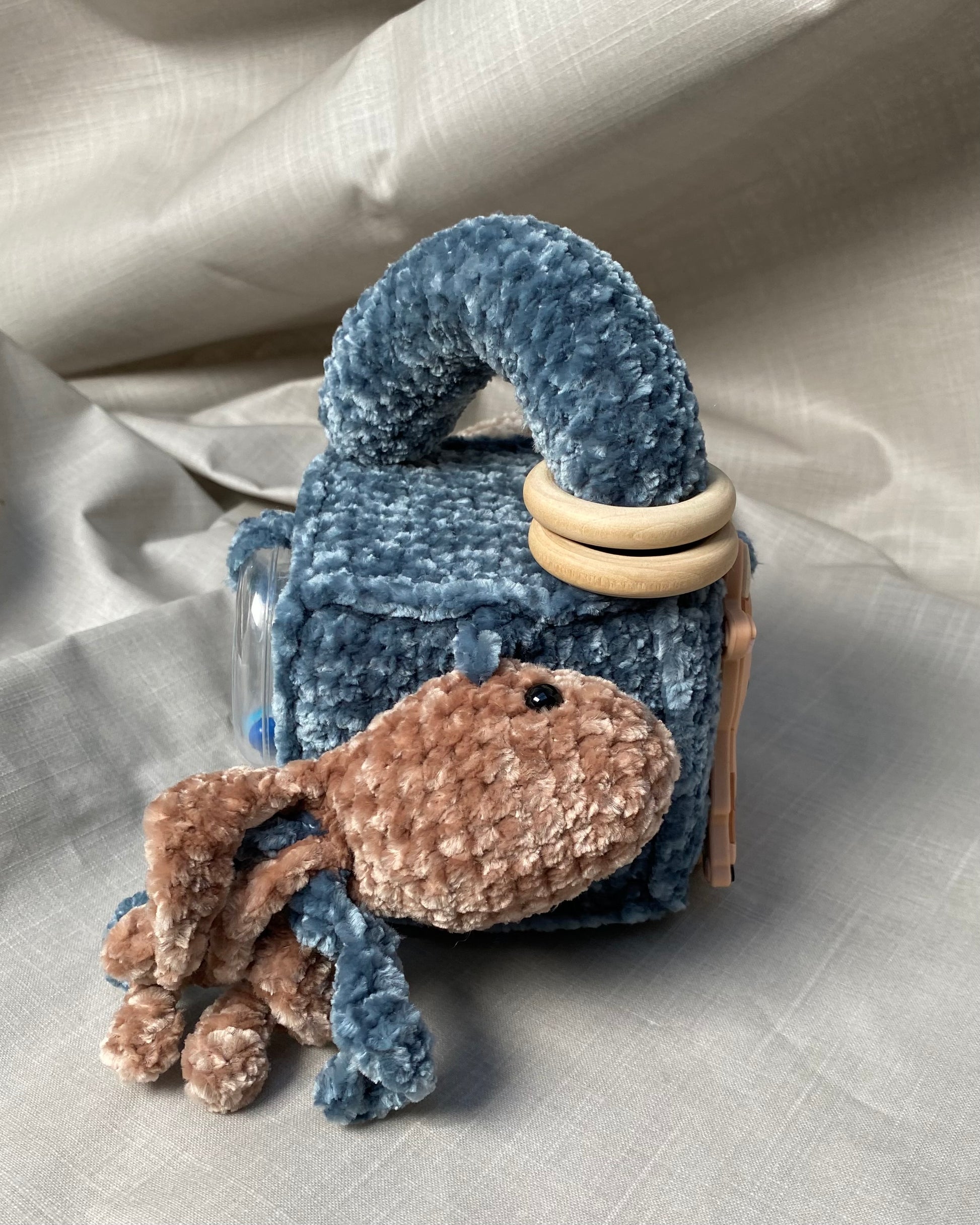 Hlíðar: Sílikon nagdýr, heklaður fiskur með tíst belg inní, hringlaga hringla, heklaður kolkrabbi með hringlu inní.