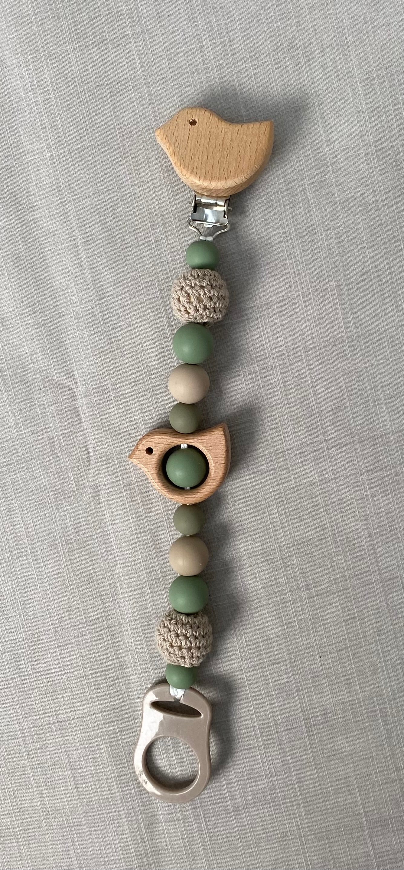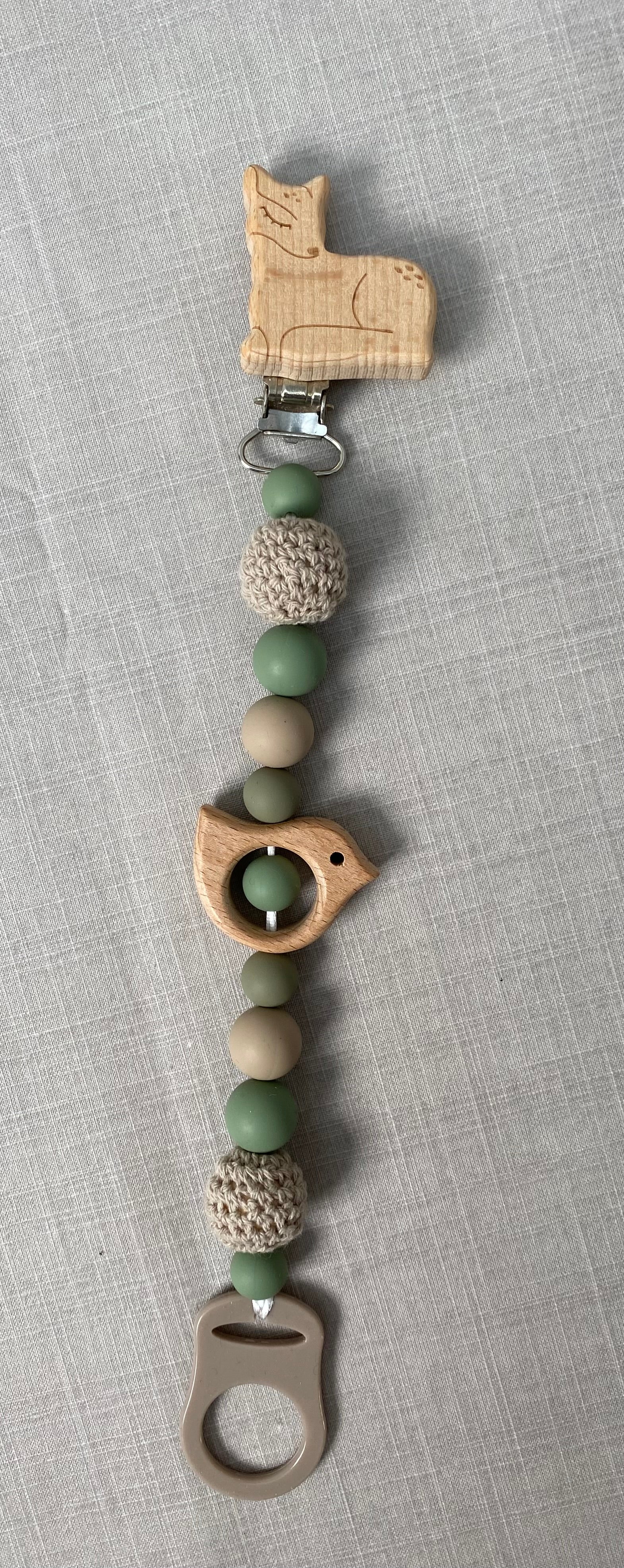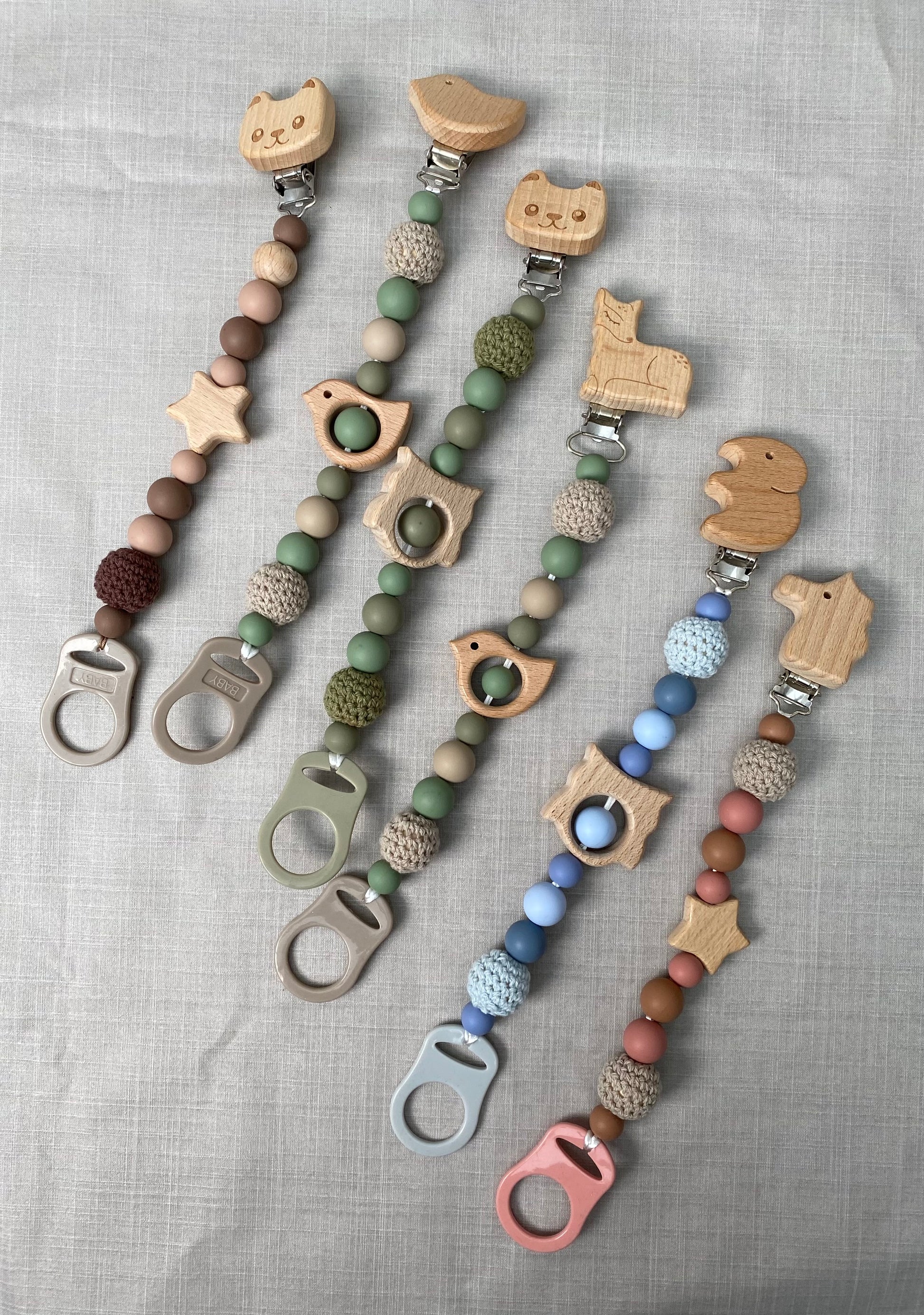 Efni: Tré klemmur, tré perlur, heklaðar tré perlur, sílíkon perlur og snúið festing