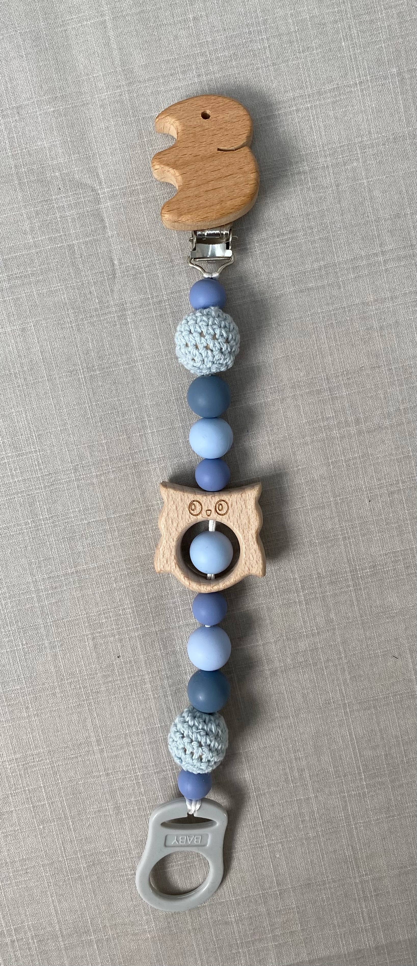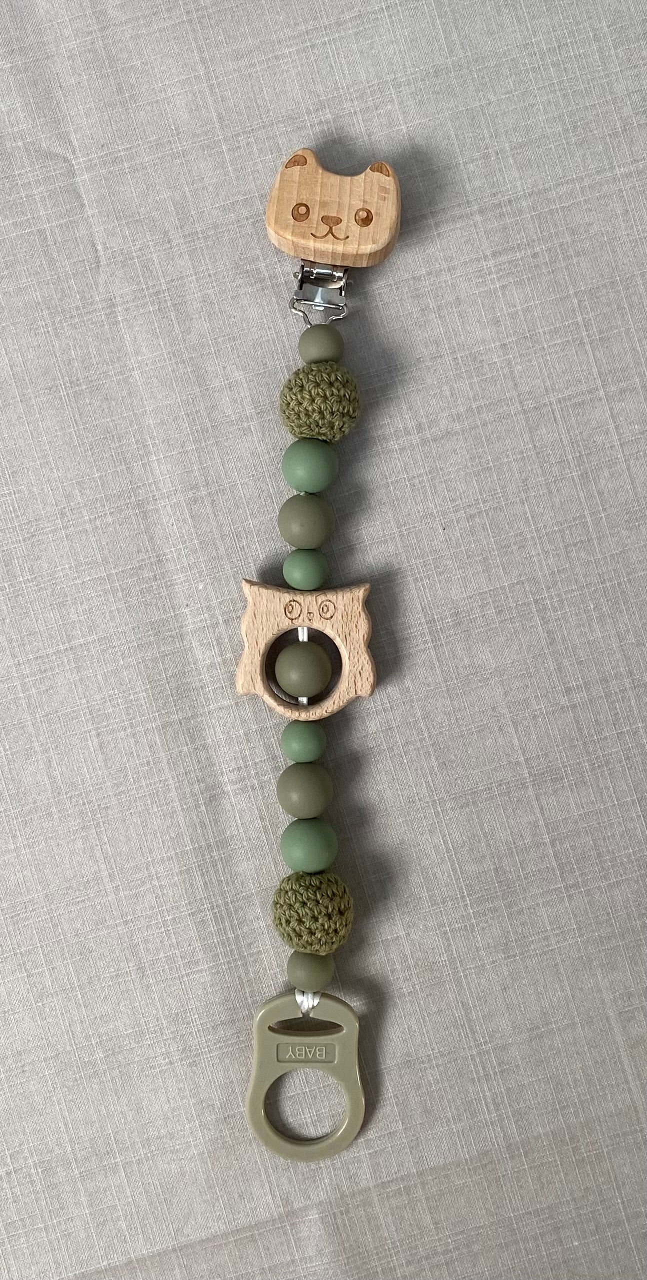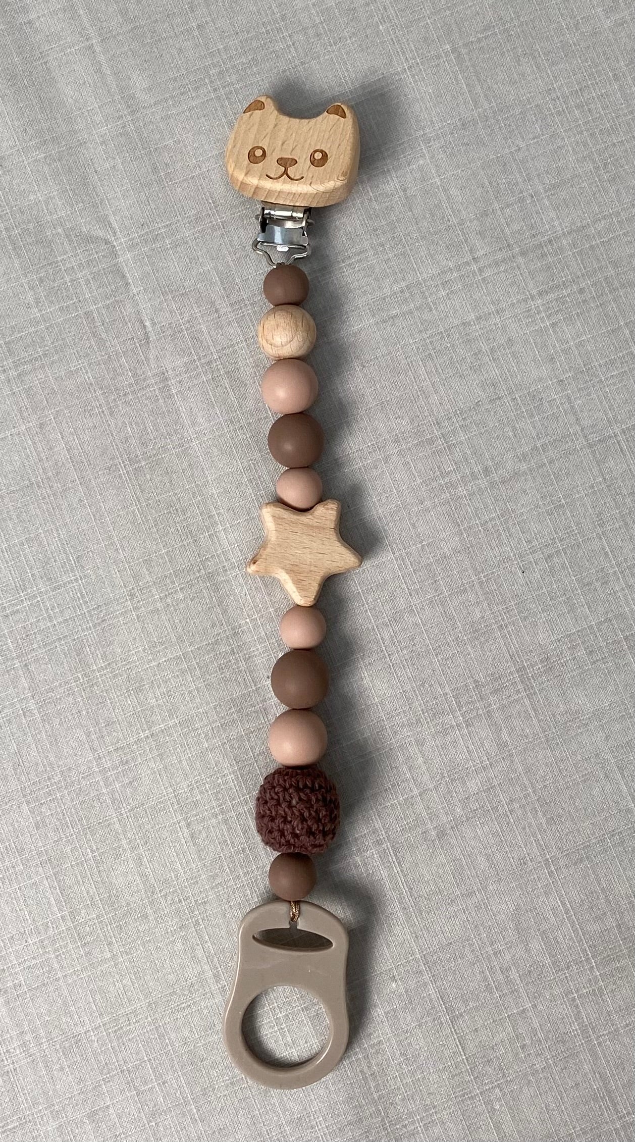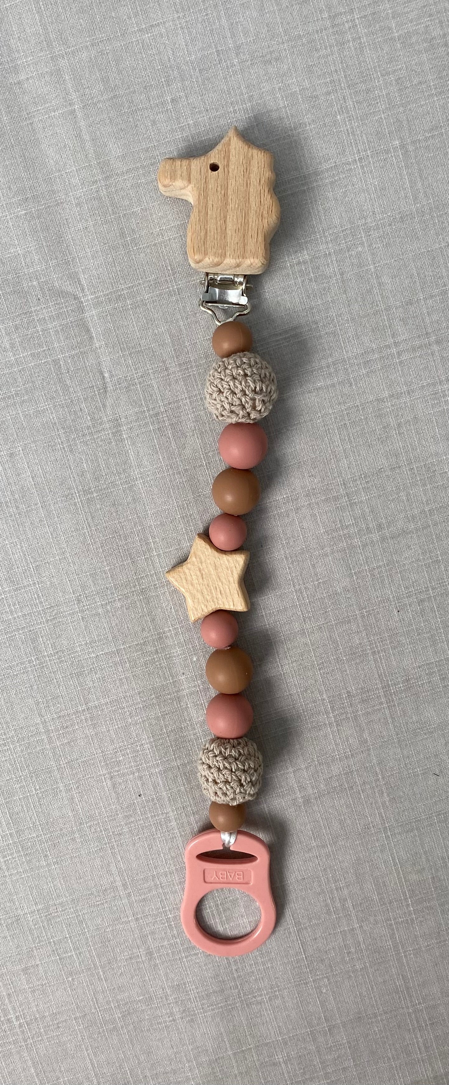 Efni: Tré klemmur, tré perlur, heklaðar tré perlur, sílíkon perlur og snúið festing